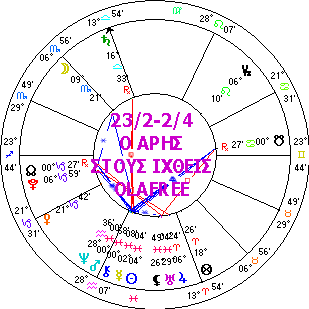 Η αστρολογια μας δείχνει, πως ο Αρης στους Ιχθεις από 23/2–2/4 θα επηρεάσει με τον συναισθηματισμό του όλες μας τις κινήσεις, ενώ θα φέρει και πολύ παρασκήνιο, σχέσεις, συναντήσεις, συμφωνίες και κινήσεις που δεν θα είναι ευρέως γνωστές. Ο πλανητης Αρης που σχετίζεται με την ενεργητικότητα, τη δράση, το σεξ και τις πρωτοβουλίες, στο ζώδιο των Ιχθύων μας κάνει υποκειμενικούς, αφού θα δρούμε βάση του συναισθήματος, αφήνοντας πίσω τη λογική. Το εξάγωνο Αρη-Πλουτωνα θα μας κάνει αρκετά δημιουργικούς, αισιόδοξους και δυνατούς να κάνουμε κάποια όνειρα και σχέδια πραγματικότητα. Η σύγκρουση του Αρη με το τον Ουρανο θα φέρει πολλές εντάσεις, ατυχήματα και πολλές ξαφνικές αποφάσεις, ενέργειες και αποκαλύψεις που θα μας συνταράξουν.